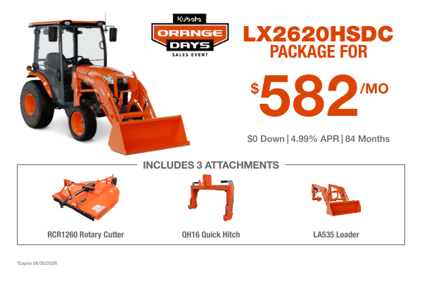 0% Down, 4.99% A.P.R. financing for up to 84 months on purchases of select new Kubota LX2620HSDC equipment from